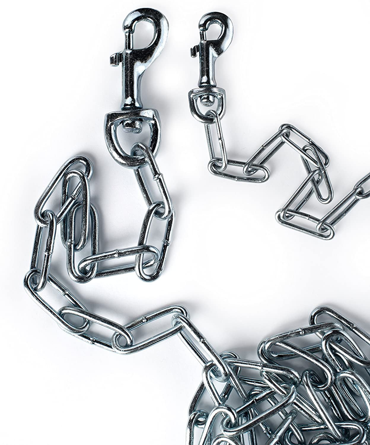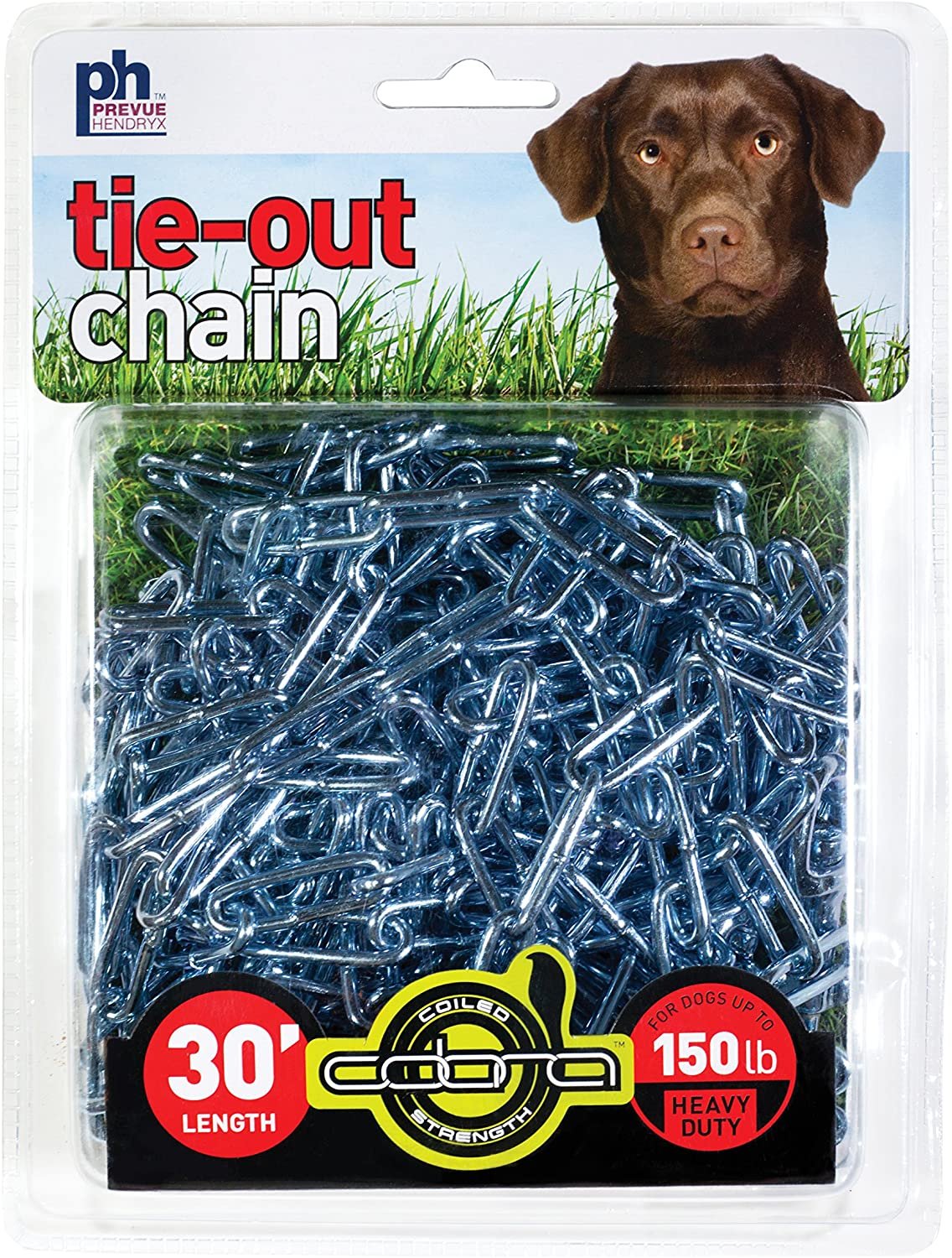 Prevue Pet Products heavy-duty 30Æ tie-out chain 2126 is designed for dogs up to 150 lbs. Zinc plated welded oval links are strong, ensuring your dog stays safe and secure. Premium quality die-cast iron swivel bolt snaps at both ends connect easily and prevent tangling. Heavy duty tie out chain is 30 foot long and 3.8 mm in diameter.