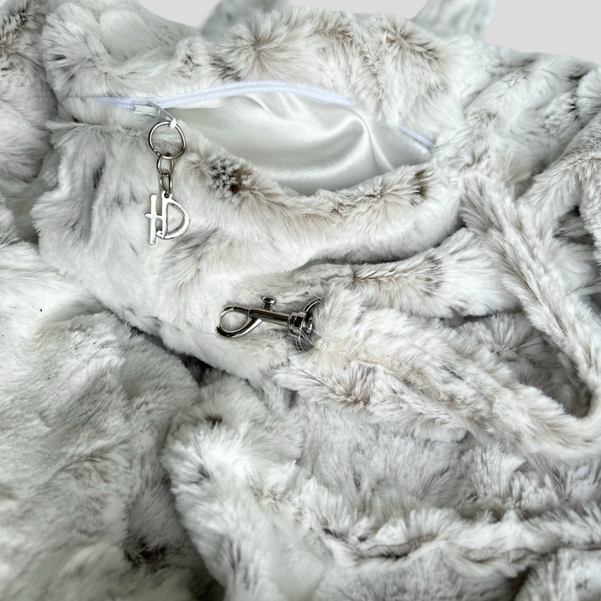 "Introducing the lovely Pearl Leopard Dog Carrier by Hello Doggie! Made from our ultra-soft and luxurious Pearl Leopard fabric both inside and out, it's the ultimate combination of comfort and style. Satin pocket with YKK zipper is the perfect place for your phone or extra treats. This carrier features a safety tether and a snap for closure to keep your baby in place along with a comfortable head rest for your prince or princess to see the world. Not only is this carrier functional and practical, but it's also cute and adorable, just like your precious baby.  LIMITED EDITION    One Size    15"" L x 6"" W x 10"" H | For dogs up to 7lbs  MSRP $196.00  *Carrier is handmade, size may vary slightly. Made in USA.*"