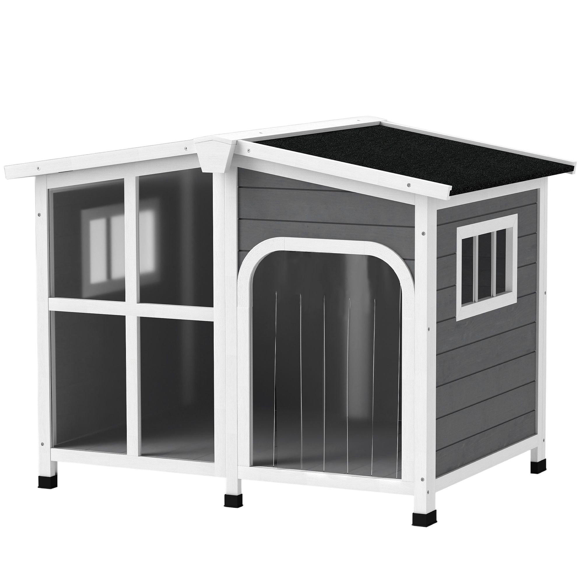 3.- Outdoor-Strong Design: The asphalt roof and water-resistant treatment on the wood is weatherproof. The door has a curtain to prevent rainwater from infiltrating the interior, yet it's still easy for dogs to enter and exit.