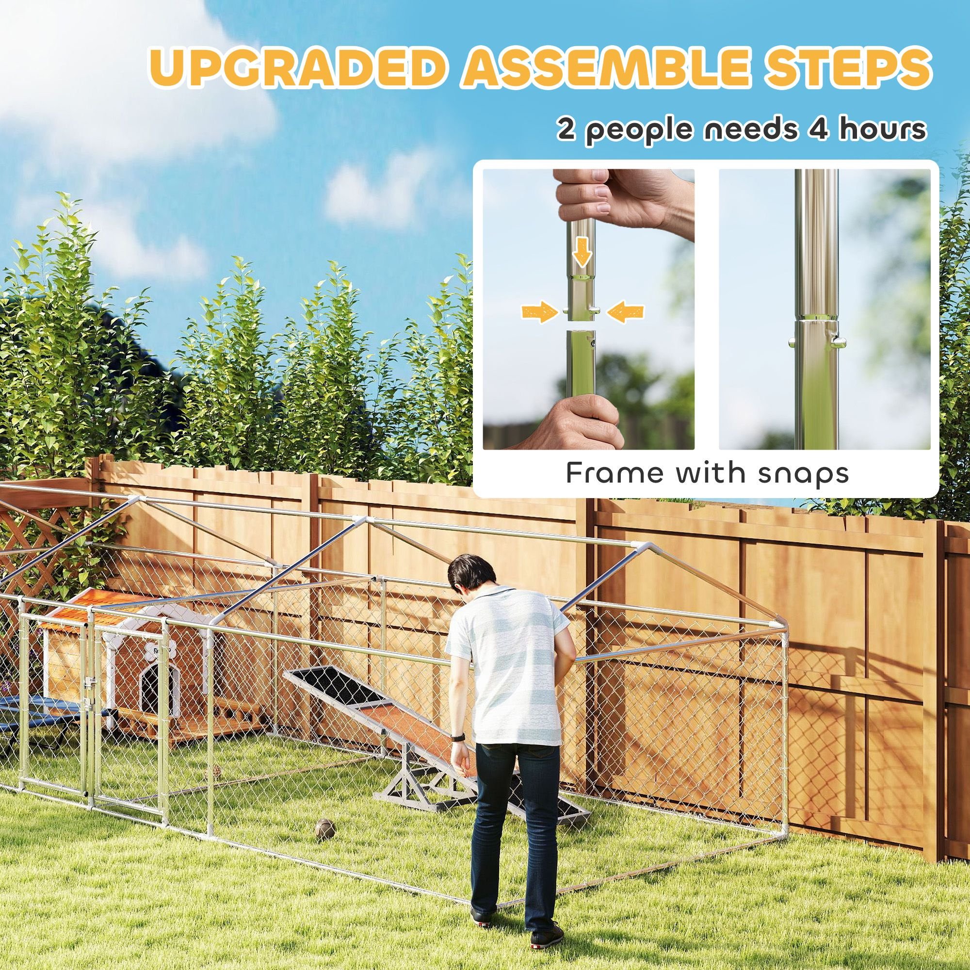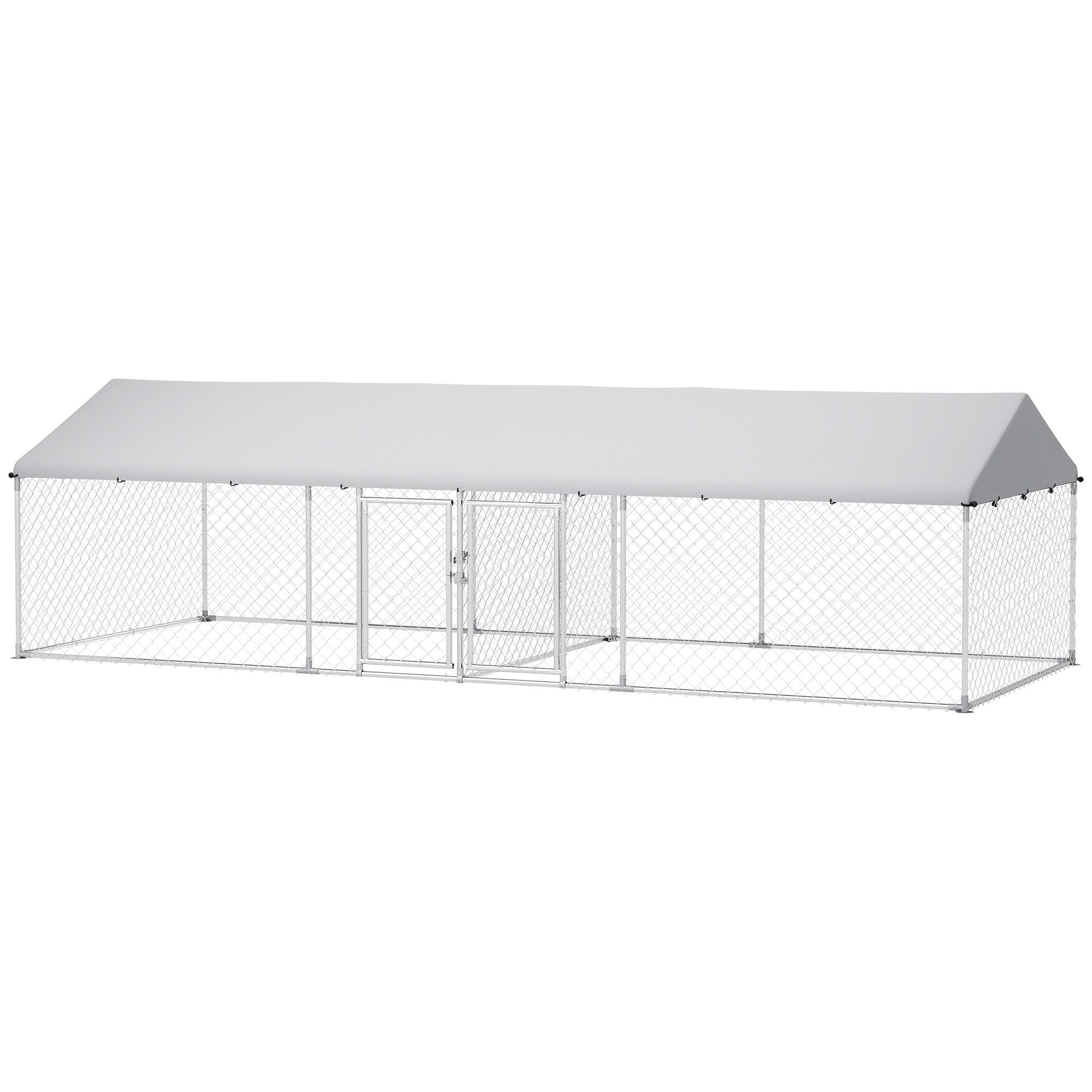 Discover the joy of spacious outdoor time for your pup with the PawHut outdoor dog kennel with roof. Offering a generous 149 sq. ft. area for play and relaxation, this two-room design outdoor dog run ensures your large dog stays safe with the galvanized steel structure and secure latch. The waterproof, UV-resistant 420D Oxford fabric roof is slanted to let water drain off and prevents it from pooling on top. Help your pet friends have fun while staying safe in the outdoors with this dog playpen!