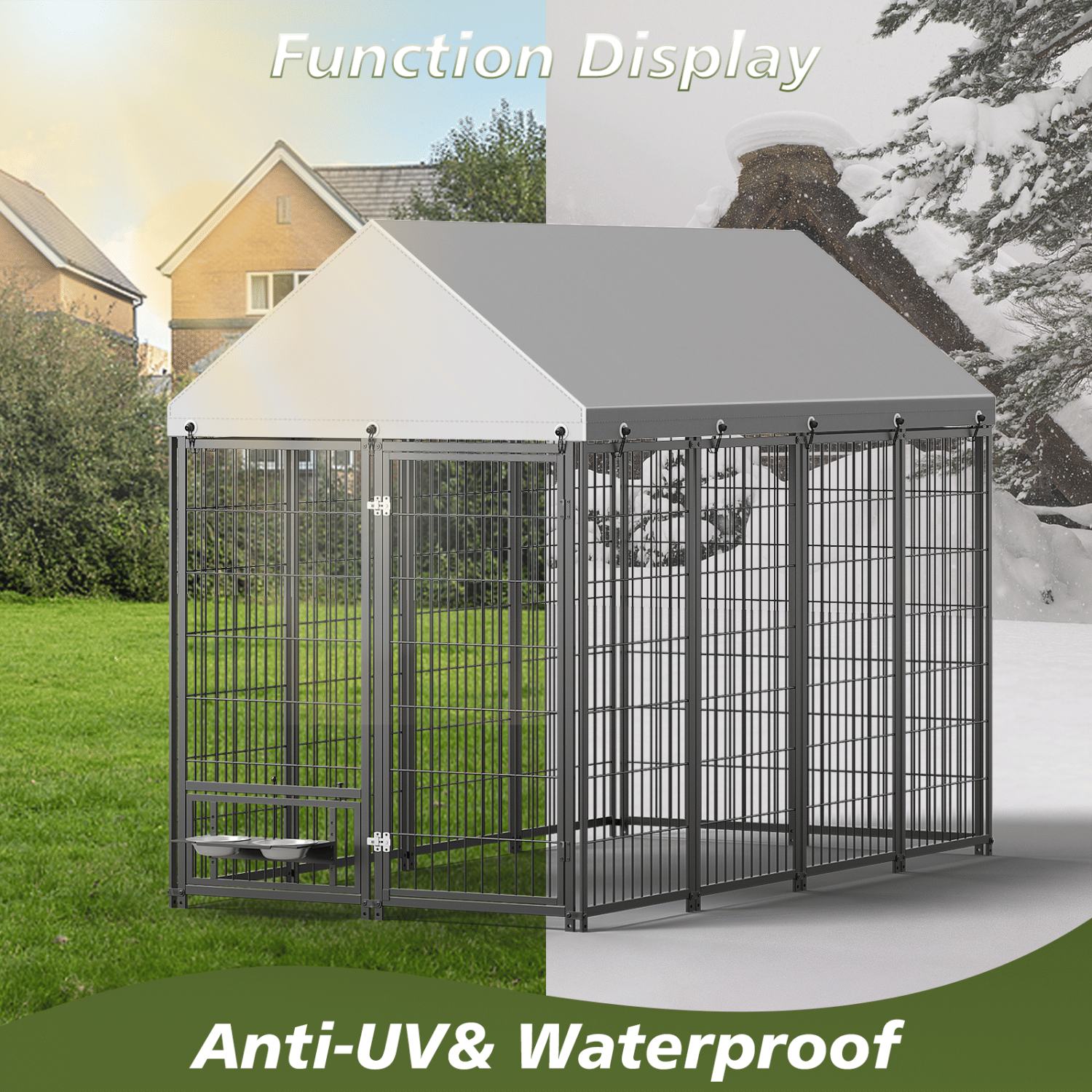 Reinforced structure: This outdoor dog cage is made of high-quality metal iron, with multiple load-bearing columns added for greater stability. The double door lock design prevents your pet from rushing out of the cage.